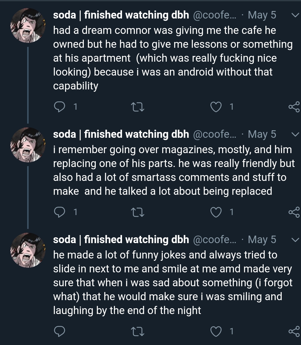 2020 reared its head around. by then i'd still just barely been hangin on, at work i was grateful to live so close to train track because it was my 'way out', and when covid hit, i wanted it-- because i could die but not kill myself. it was a selfish thing, but when you're suicidal, you dont really think about how it sounds when you write about it in the future. regardless, i wanted 2020 to be 'cringe but free', my resolution was to just like what i like out loud and be more open about it. after all, we were all in lockdown anyway with no end in sight, and a scary pandemic killing millions of people around the world. still thinking about how, while i did wanna die, i didnt wanna die miserably, i let myself indulge again in DBH-- connor, more specifically. i would openly have a crush on him, talk about him, etc. i would be fearless. i binged a lot of videos and then had three connor dreams in a row-- as expected, because thats what happens when you consume a lot of media of the same thing!! but as always, the dreams with him were so insanely vivid, so real.